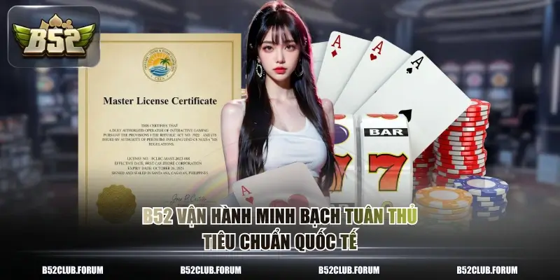 B52club hoạt động hợp pháp dưới sự giám sát của Costa Rica Gaming Commission, tổ chức cấp phép nổi tiếng trong lĩnh vực trực tuyến. Thương hiệu còn được chứng nhận bởi BMM Testlabs và Gaming Laboratories International, hai tổ chức kiểm định hàng đầu thế giới. Tỷ lệ hệ thống vận hành ổn định đạt 99,95%, vượt chuẩn của các nhà cái trong khu vực.